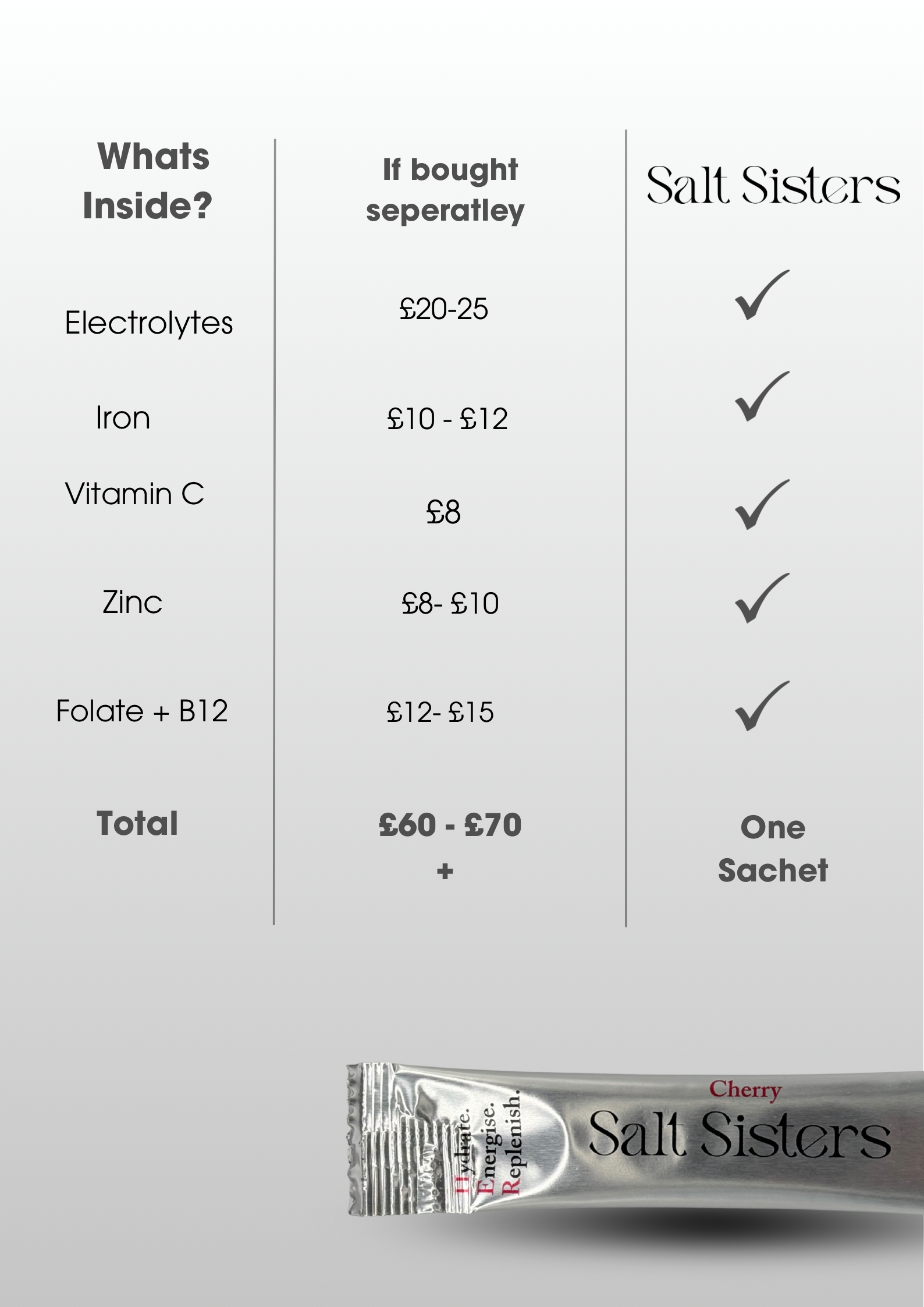 Potassium Citrate, Himalayan Rock Salt, Magnesium Citrate, Vitamin C (Ascorbic Acid), Iron Bisglycinate, Zinc Citrate, Methyl-Folate, Methylcobalamin (Vitamin B12), Natural Flavour (Morello Cherry / Mango), Natural Colours (Beetroot, Beta Carotene), Citric Acid / Malic Acid, Anti-caking Agent (Silicon Dioxide), Sweetener (Stevia).